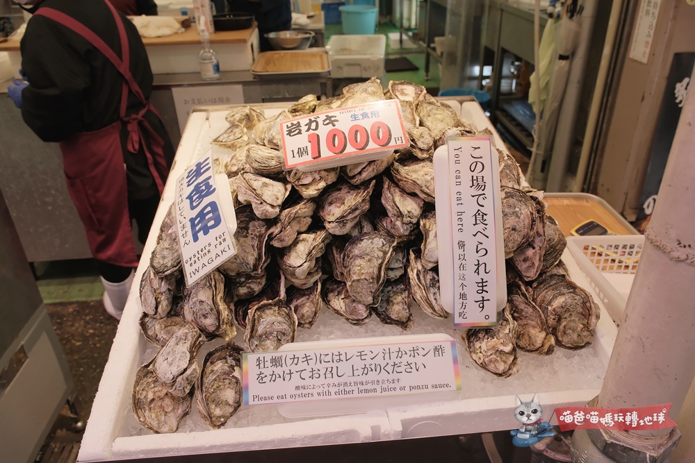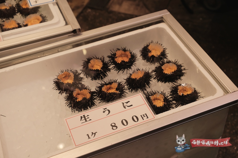 許多懶人包會拿著近江町市場地圖畫呀畫告訴你哪家店必吃,但喵爸覺得近江町市場的海鮮鮮度都在水準之上,與其執著於某家排隊名店,不如利用種類攻略法一路狂吃下去,看到哪家順眼、食材喜歡就直接停下腳步,隨逛隨吃這才是逛市場的樂趣!
