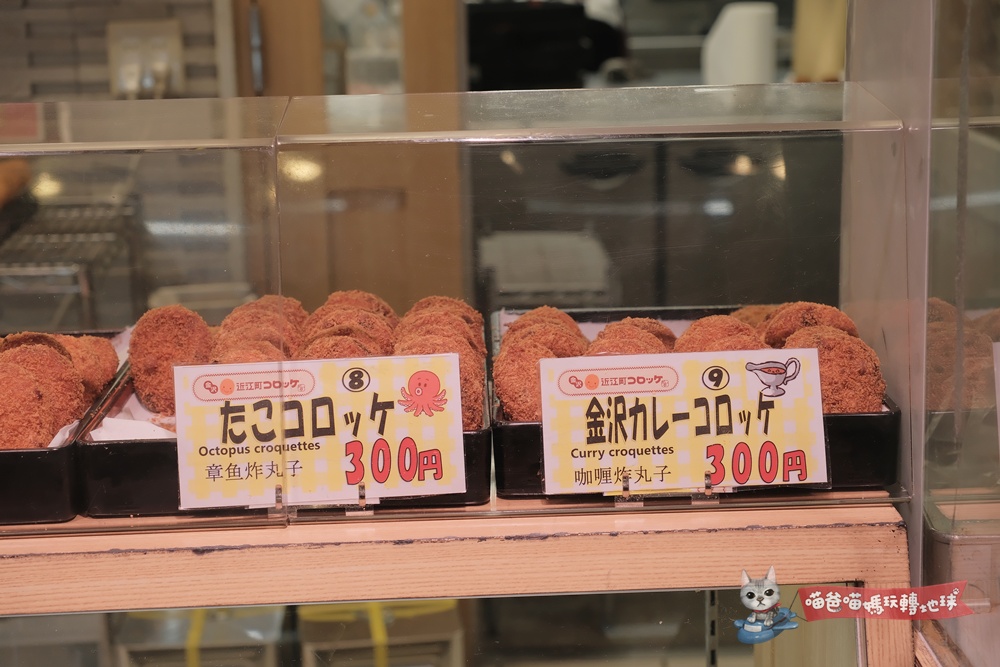口味多達十幾種,人氣最高的是「甜蝦可樂餅」和「螃蟹奶油可樂餅」。金澤產的甜蝦鮮味濃縮在馬鈴薯泥裡,外皮炸得酥酥脆脆,咬下去還會牽絲。喵爸和喵媽經過總是會忍不住一人買一個。
