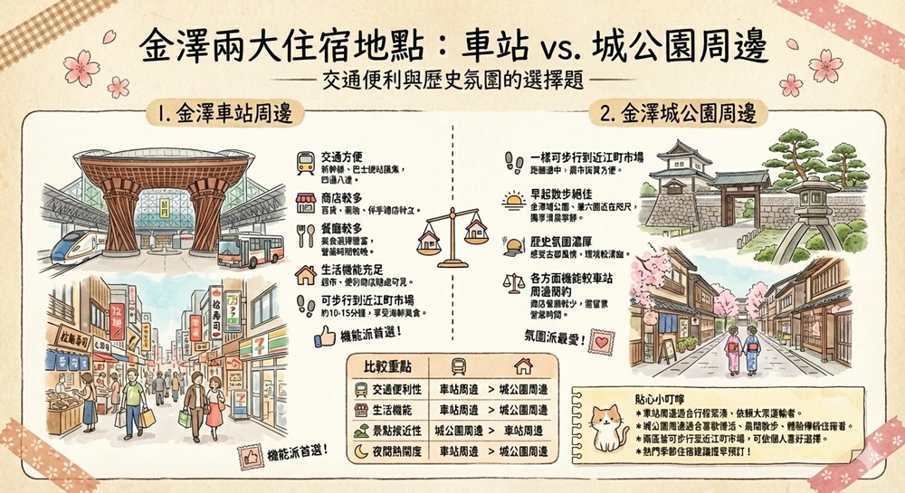 兩天一夜對金澤市區來說相當足夠,金澤兩大住宿地點:金澤車站周邊、金澤城公園周邊都能很優閒地散步到近江町市場,不用預定飯店早餐,直接就去市場裡面解決就好^^