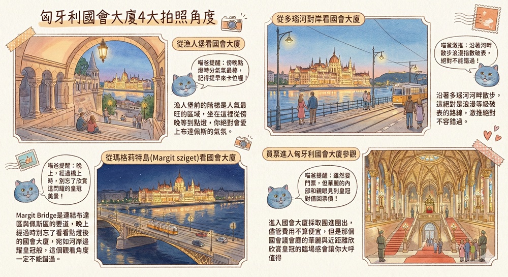 人氣最旺的城堡山漁人堡(Halászbástya)觀景台、角度最正的多瑙河正對面平台、鄰近瑪格莉特島的Margit Bridge、買票進入匈牙利國會大廈參觀,把這四個匈牙利國會大廈樣貌全部收集齊全,我想你的布達佩斯體驗就真的堪稱完美。