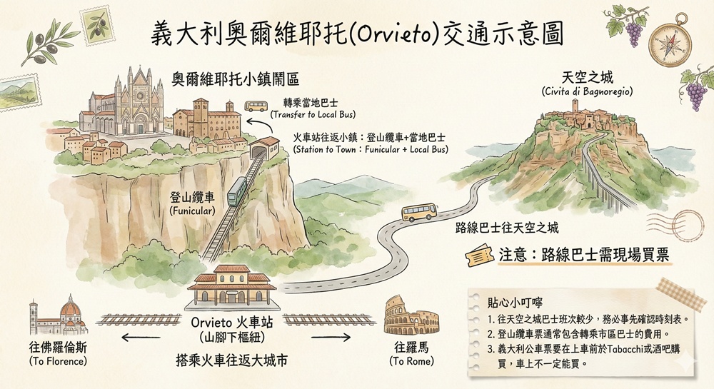 奧爾維耶托聯外交通依靠山腳下的Orvieto火車站(可以搭車前往羅馬或佛羅倫斯),從火車站要前往小鎮需要搭乘登山纜車與當地巴士,前往天空之城則是路線巴士,周邊交通狀況(如下圖)並不難懂。