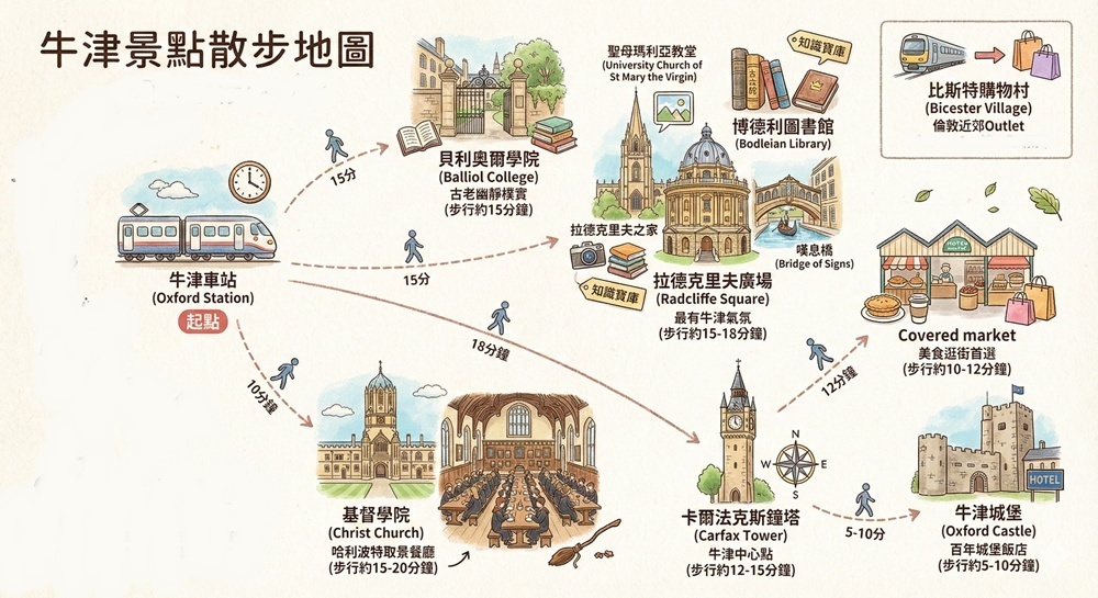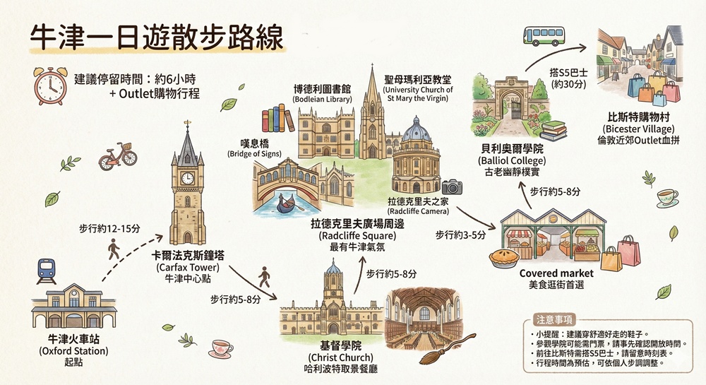 牛津散步路線:牛津火車站>卡爾法克斯鐘塔(Carfax Tower)>基督學院(Christ Church)>拉德克里夫廣場周邊(嘆息橋、博德利圖書館、聖母瑪利亞教堂、拉德克里夫之家)>Covered market>貝利奧爾學院(Balliol College)>搭車前往比斯特購物村