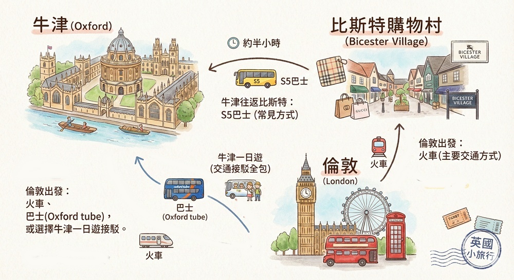 交通:火車往返倫敦,牛津與outlet之間選擇巴士