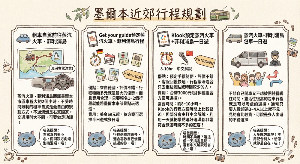 租車自駕、當地旅遊團、包車自行規劃,這三種是規劃墨爾本近郊行程最常用的方式。
