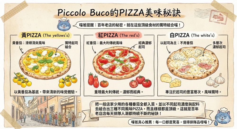 黃PIZZA、紅PIZZA與白PIZZA,Piccolo Buco主打就是使用不同品種番茄去製成的三種不同風味塗醬,再搭配讓人印象深刻的超Q彈餅皮,難怪從1916年開始營業後,天天都排隊排到天長地久。