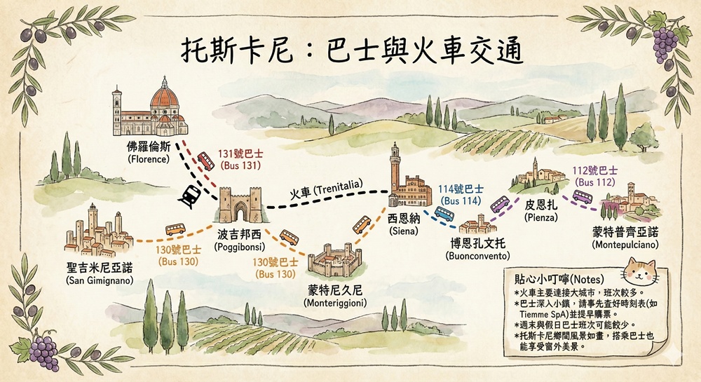 方式:從西恩納(Siena)搭路線巴士114號前往博恩孔文托(Buonconvento),再轉乘路線巴士112號