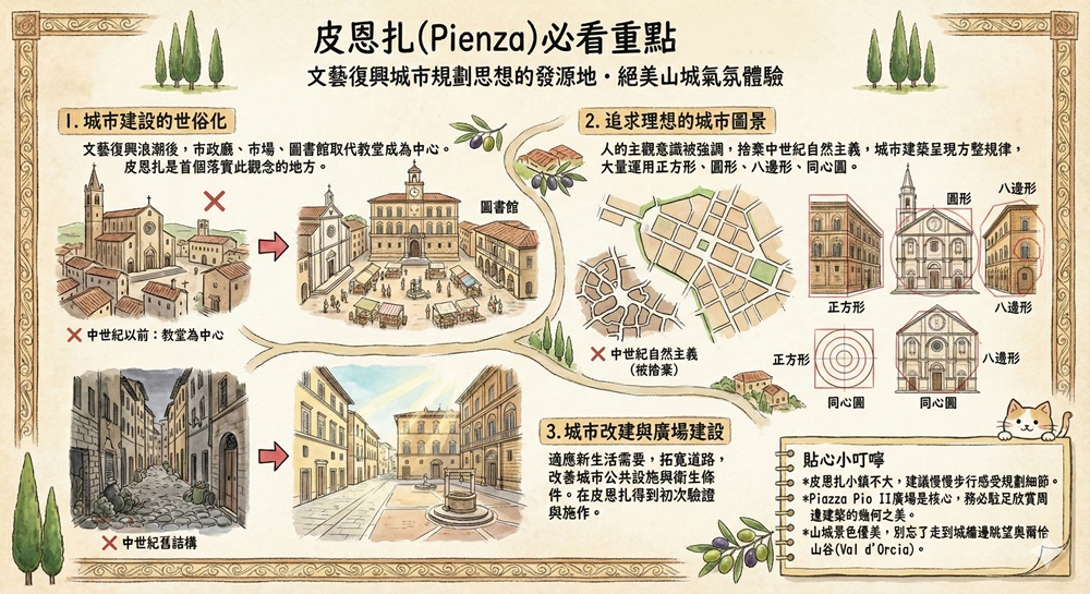 人的主觀意識進一步被強調的文藝復興時期,中世紀所崇尚的自然主義漸漸被捨棄,反映在城市建築上就是越來越方整規律,大量的正方形、圓形、八邊形、同心圓都出現在皮恩扎小鎮中,而那個皮恩扎主教座堂(Duomo di Santa Maria Assunta)就是其中的代表。