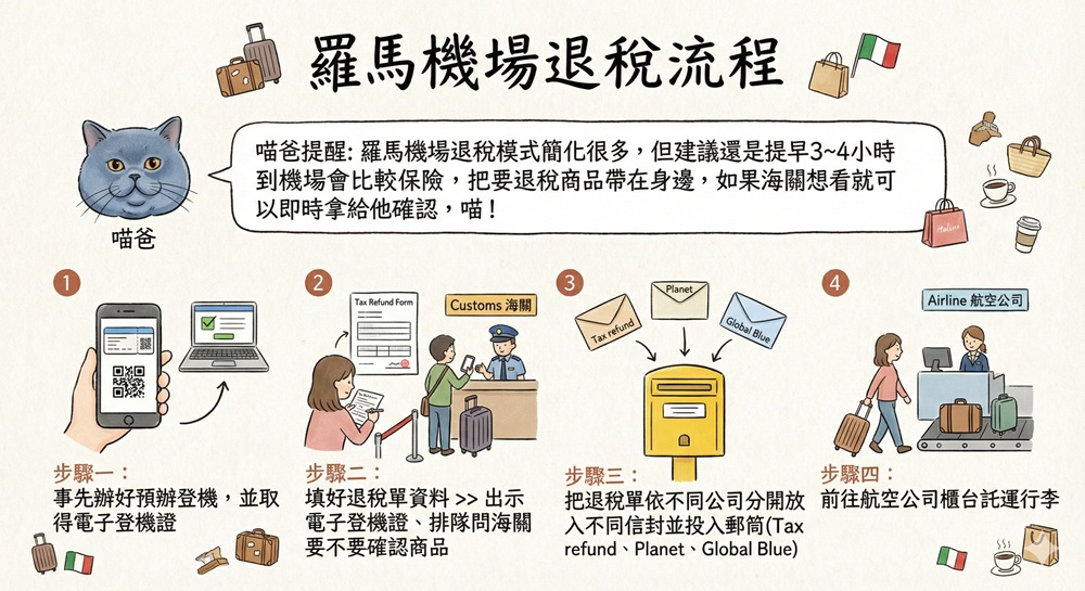 羅馬機場近年退稅模式簡化很多(但喵爸建議還是提早3~4小時到機場會比較保險),把要退稅商品帶在身邊,如果海關想看就可以即時拿給他確認。
