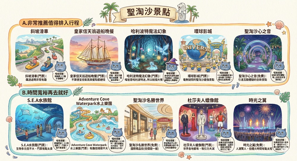 聖淘沙上景點超過十個以上、喵爸推薦的景點更是高達五個,想順利在聖陶沙島上好好玩樂一番,對於交通、餐廳推薦都不可不知,如果你打算在聖淘沙上住一晚,喵爸也幫你找到很好卻又不貴的飯店。