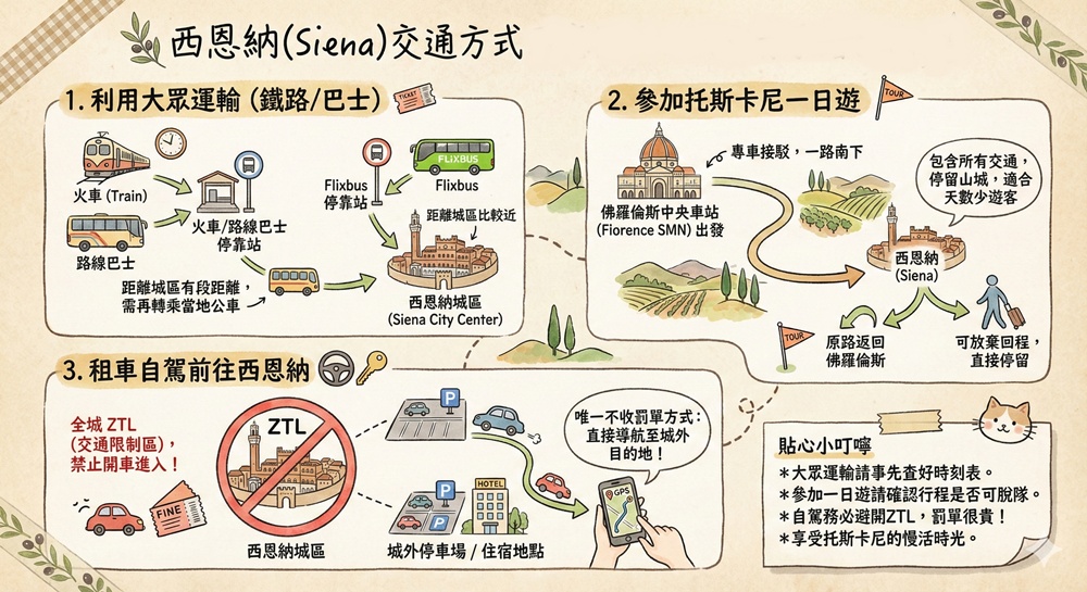 利用大眾運輸(鐵路或巴士)、參加西恩納一日旅遊團、租車自駕,這就是前往西恩納(Siena)常用的三種交通方式(城區內交通大多會以步行為主,所以喵爸略過不提)
