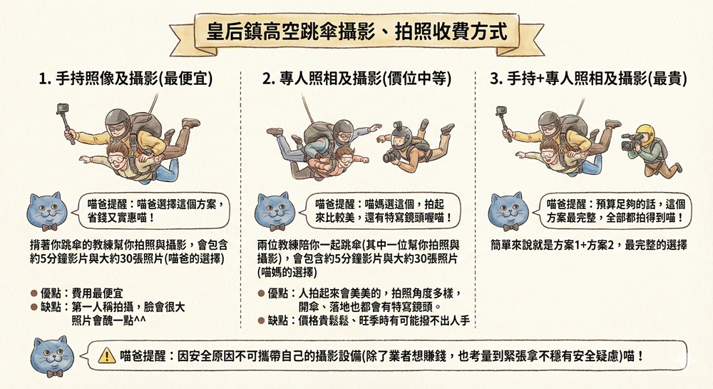喵媽選擇的照相、攝影方案是專人照相及攝影,也就是會有第三人一起跳傘並幫你拍照紀錄(當然啦…太醜的照片喵媽都不准喵爸放,影片喵媽也決定自己珍藏就好^^)