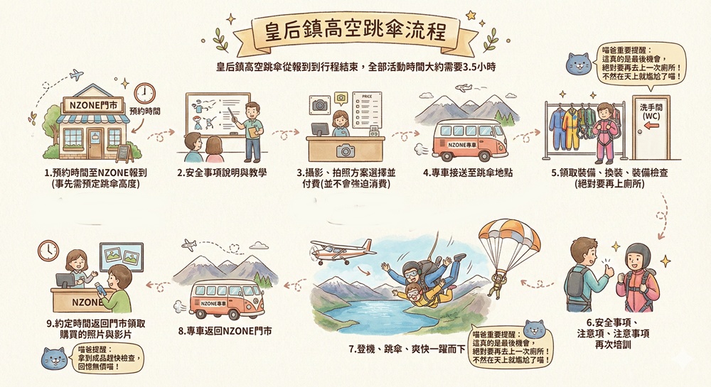 皇后鎮高空跳傘從報到到行程結束,全部活動時間大約需要3.5小時,大概流程是: