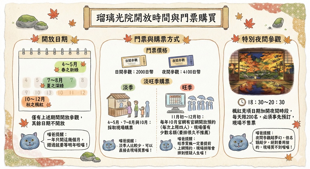 瑠璃光院開放日期:每年僅有4~5月、7~8月、10~12月會開放參觀,其餘日期不開放