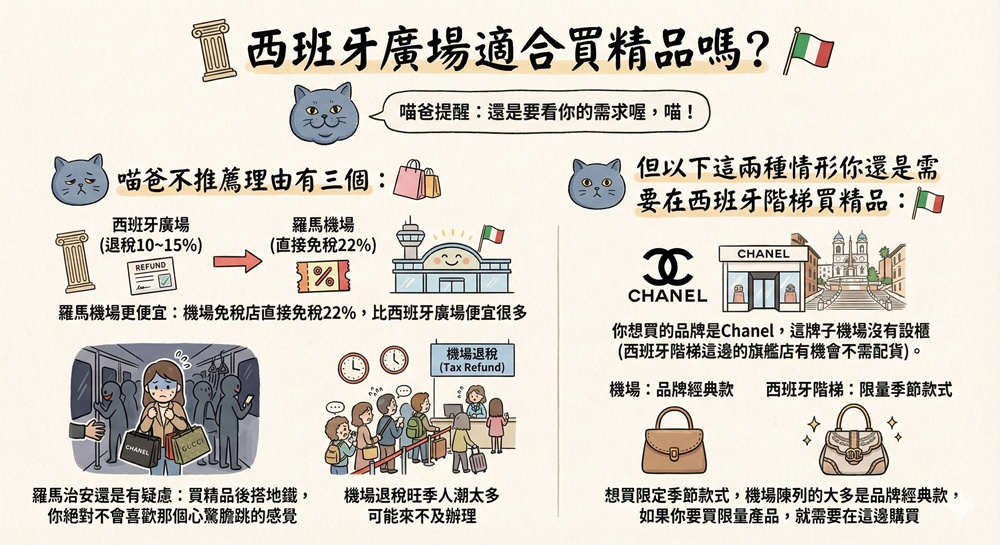 1.羅馬機場更便宜:機場免稅店直接免稅22%,比西班牙廣場便宜很多(只能退稅10~15%)