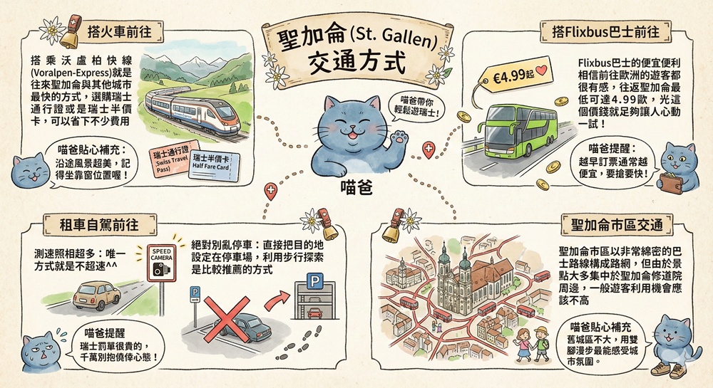 喵爸在聖加侖的行程規劃是:聖加侖修道院>>修道院圖書館>>舊城區散步>>起司火鍋>>住宿一晚隔天前往森蒂斯峰(Santis)與阿彭策爾(Appenzell)