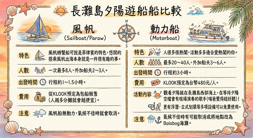 長灘島日落遊船該選擇活動體驗豐富的動力船,還是選擇行程最悠閒的風帆船?就讓兩種體驗都參加的喵爸分享經驗吧!