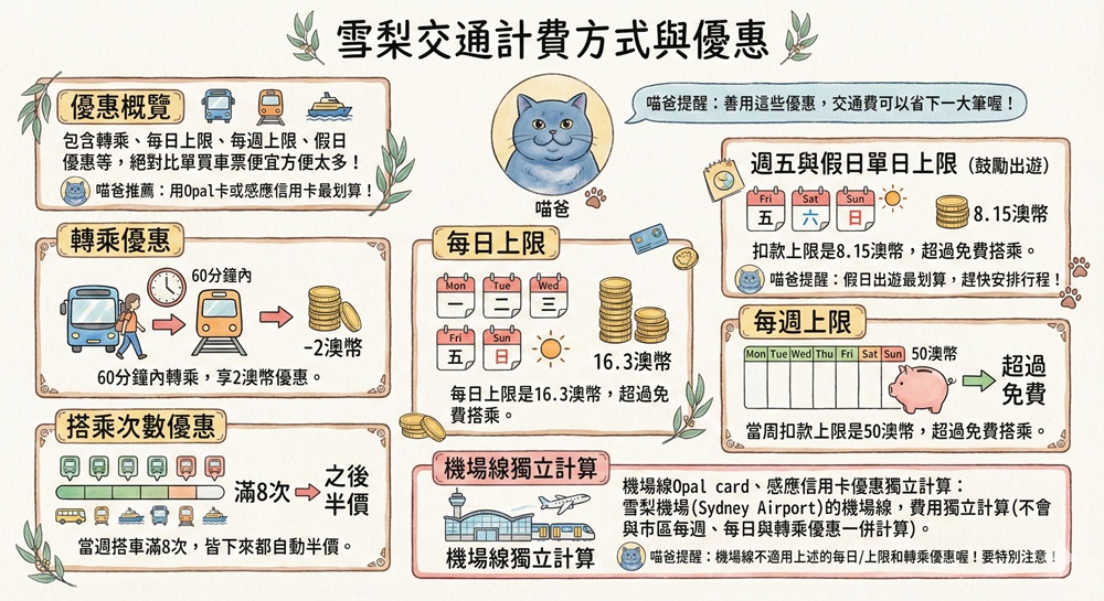 周五與假日上限:單天8.15澳幣,超過免費搭乘。