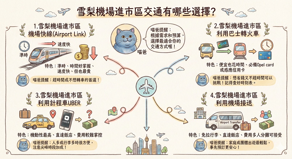 雪梨機場進市區的交通方式有哪些?機場快線(Airport Link)、機場巴士轉火車、招台計程車或Uber、預約機場包車接送…,五種從雪梨機場進市區的交通規劃方式哪一種最適合我?