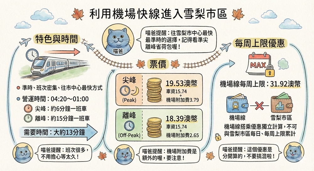 費用:離峰18.39、尖峰19.53澳幣,單程約13分