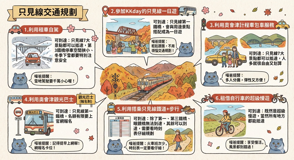 自駕、奧會津計程車、觀光巴士、只見線+步行,喵爸列出6種規劃只見線鐵道最常使用的交通方式,當然如果覺得這6種方式都太燒腦,KKday也有推出搭巴士遊只見線的一日遊。
