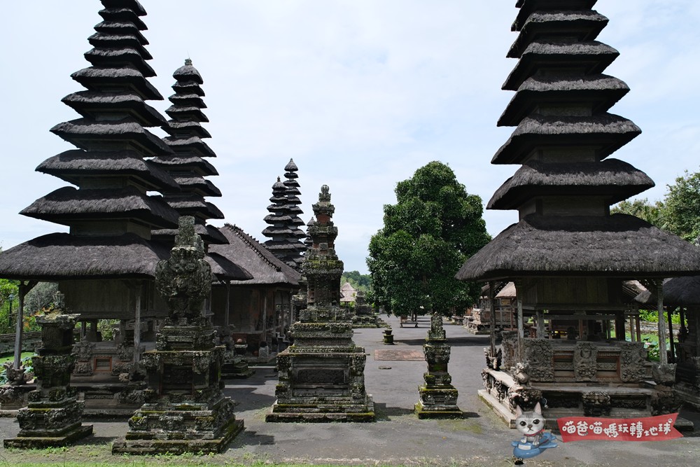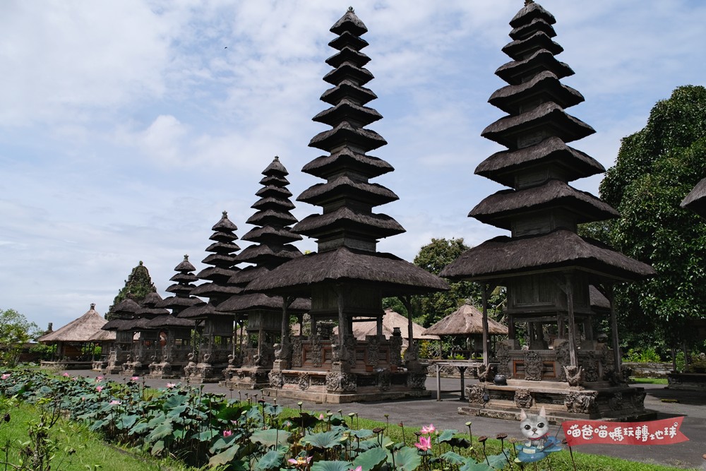 繞著塔曼阿尤寺(Pura Taman Ayun)走上一圈,層層相疊的黑色茅草塔林(Meru)可說是必看的重點,象徵不同神祇與天地宇宙的交錯,也像是一排羽毛扇在隨風搖曳,非常壯觀。