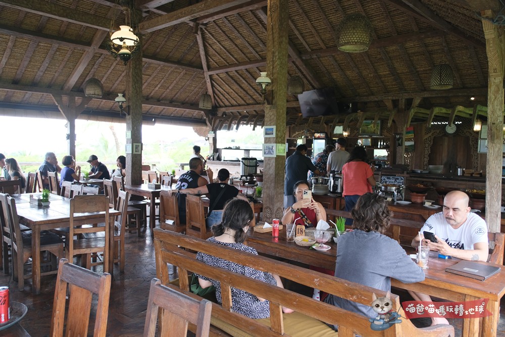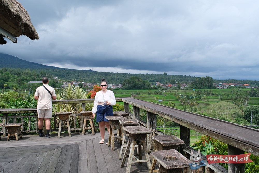 沿著田間小路走上一段,我們就回到梯田旁制高點咖啡廳,頗為樸實的這裡供應是看起來不太討喜的印尼式自助餐,點了杯咖啡在平台上面發起呆,或許二月的賈蒂盧維梯田(Jatiluwih Rice Terraces)並不是全年最美季節,不過居高臨下倒也是心曠神怡。