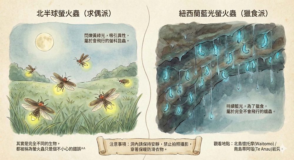 北半球的螢火蟲為了吸引異性而拖著尾燈,屬於一閃一閃會飛行的螢科類昆蟲;南半球的螢火蟲則是為了獵食而發光,屬於完全不會飛行的蠕蟲。簡單來說,南北半球的螢火蟲其實是完全不同的生物,都被稱為螢火蟲只是個不小心的錯誤^^
