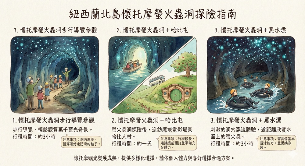 懷托摩螢火蟲洞位於紐西蘭北島,由於觀光發展較早,所以旅遊方案選擇性較多,常見的方案有三種: