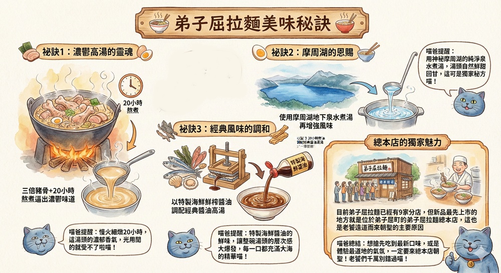 經過20多年的版圖拓展,目前弟子屈拉麵已經有9家分店(北海道6家,東海地區1家,關西地區1家、九州1家),雖然取名弟子屈拉麵,但其實一開始是取源於札幌市西區,並在努力拼鬥下第4年才將總本店遷回弟子屈町,這也才把店內招牌的醬油與味增湯頭風味確定下來。