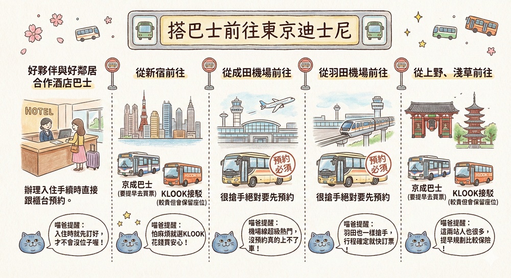 搭巴士往返東京迪士尼的出發點有:新宿、淺草、上野、成田機場、羽田機場與迪士尼好夥伴酒店、好鄰居合作酒店,如果你的出發點沒有在這裏面就代表你的行程不適合用巴士規劃^^