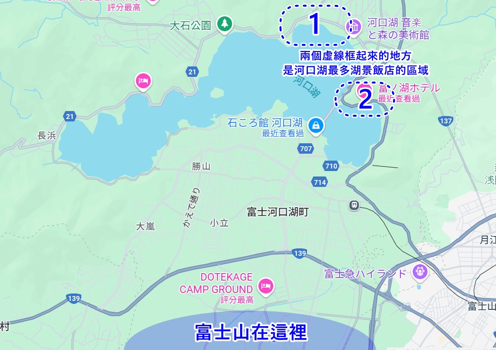 你看到這裡應該會覺得富之湖飯店的位置應該很差吧?那你就大錯特錯了。河口湖湖景飯店最推薦的區域就是下圖虛線框1與虛線框2(這兩個地方都是拍攝逆富士的最佳地點)