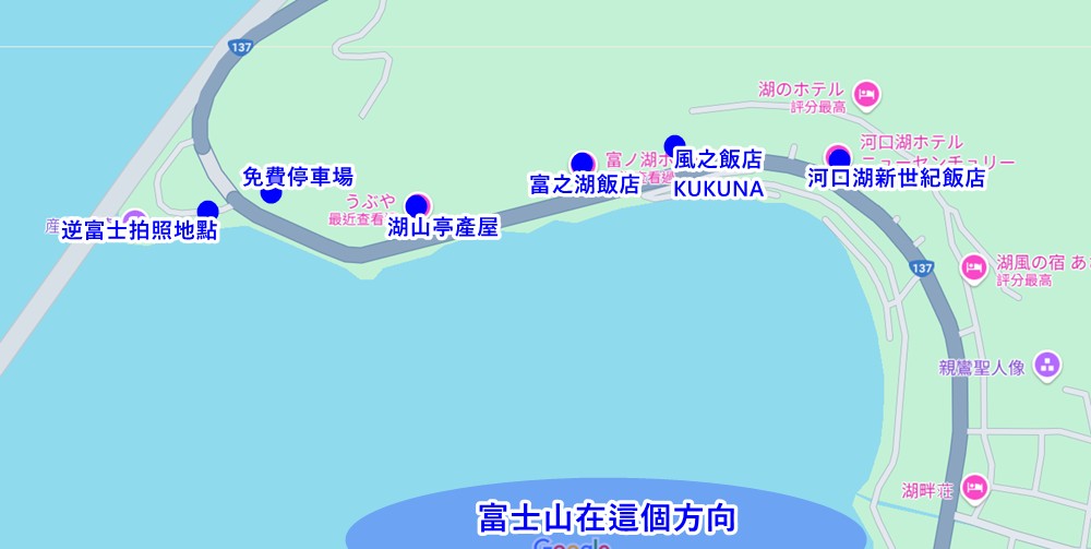 富之湖飯店的位置就在湖山亭產屋與風之飯店KUKUNA中間(角度甚至比河口湖新世紀飯店還要更好),這兩家高檔飯店每晚都是上萬台幣以上,並且以富士山景聞名,從這裡就可以知道富之湖飯店望出去的景色絕對不會太差。