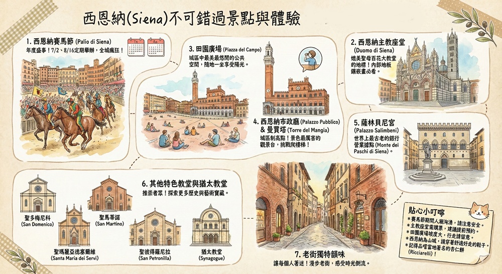 西恩納主教座堂(Duomo di Siena)、田野廣場(Piazza del Campo)、曼吉亞塔樓(Torre del Mangia)、西恩納賽馬節….,想在托斯卡尼找個山城住上一晚,西恩納絕對就是不作二想的首選。