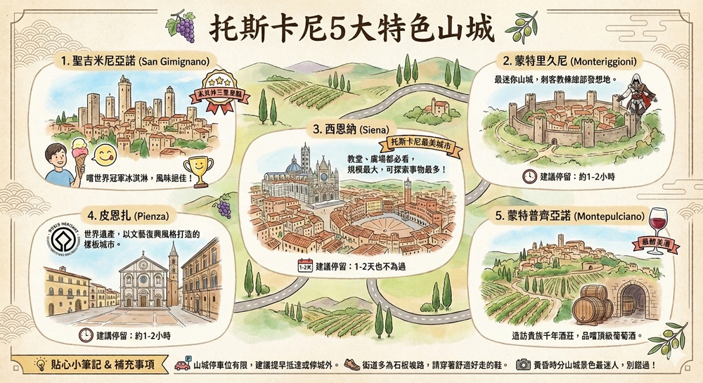 聖吉米尼亞諾(半天)、蒙特里久尼(兩小時)、皮恩扎(兩小時)、蒙特普齊亞諾(兩小時)、西恩納(兩天),當然這都只是喵爸個人喜好建議,如果有更足夠時間當然就是把腳步放的更慢更慢。