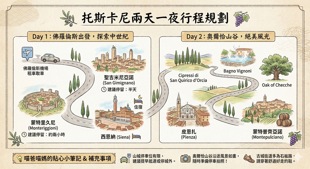 自行開車、利用兩天一夜將托斯卡尼走了一趟的喵爸喵媽,行程規劃是這樣的:
