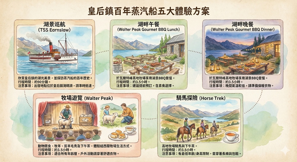 皇后鎮百年蒸汽船往返於皇后鎮與瓦爾特峰高地牧場之間,除了單獨購買船票航行更有許多獨特體驗可以搭配參加。