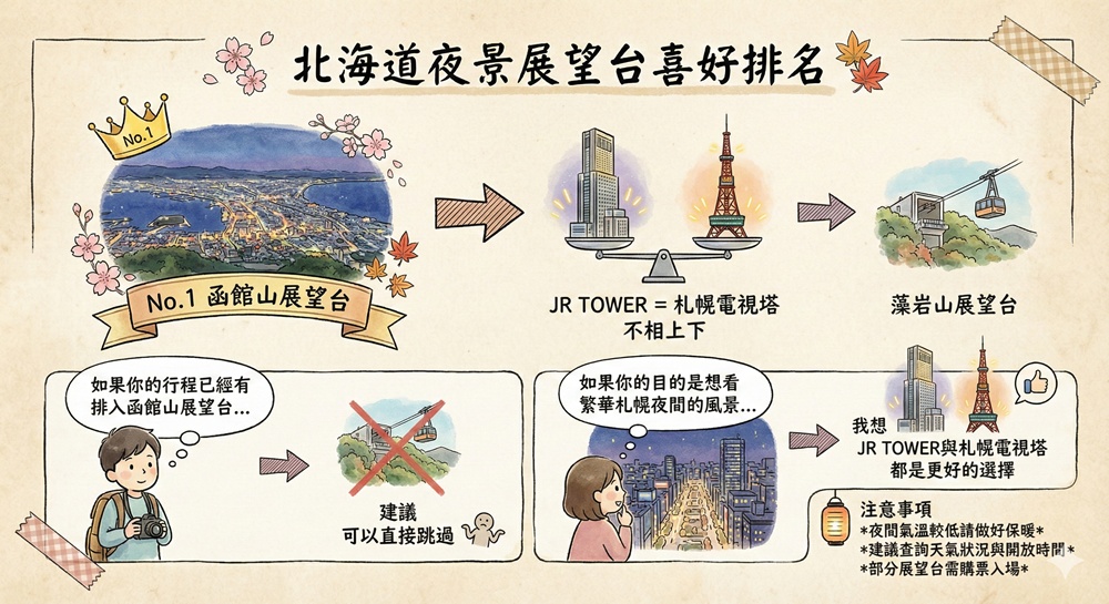 札幌電視塔、JR塔展望室T38、藻岩山展望台被譽為是札幌三大夜景聖地,藻岩山可看到札幌遼闊風景、JR塔展望室T38則是聚焦在車站周邊風光、而最老牌的札幌電視塔則是面對大通公園,可說是各有各自的風景顏色樣貌。