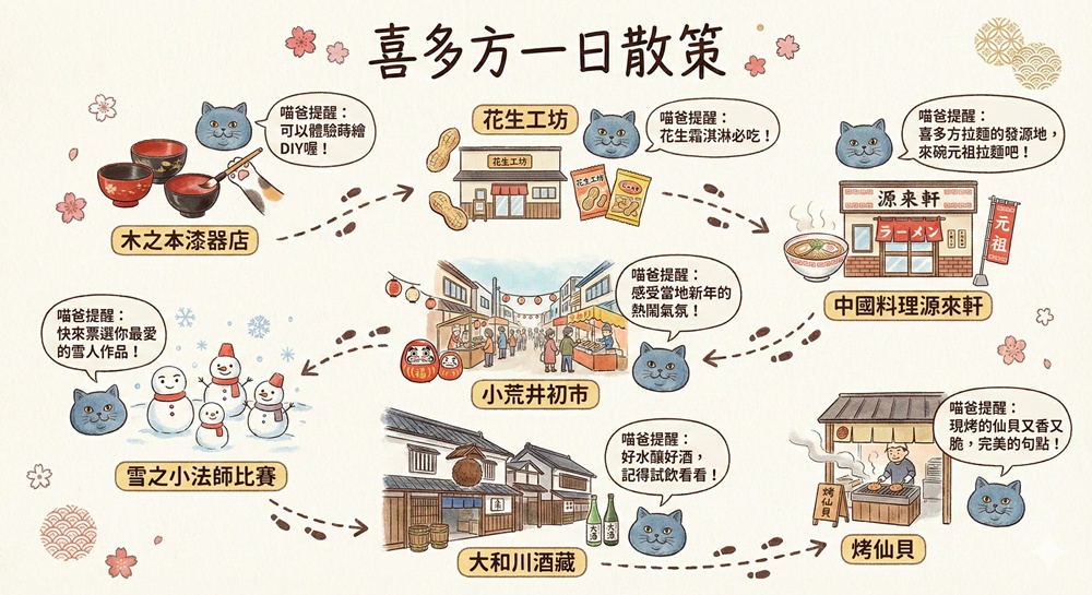 喵爸造訪喜多方這天是1/12,恰好碰上一年一度的喜多方小荒井初市舉辦期間,喵爸的一日散策行程是:木之本漆器店>>花生工坊>>中國料理源來軒>>小荒井初市>>雪之小法師比賽>>大和川酒藏>>烤仙貝
