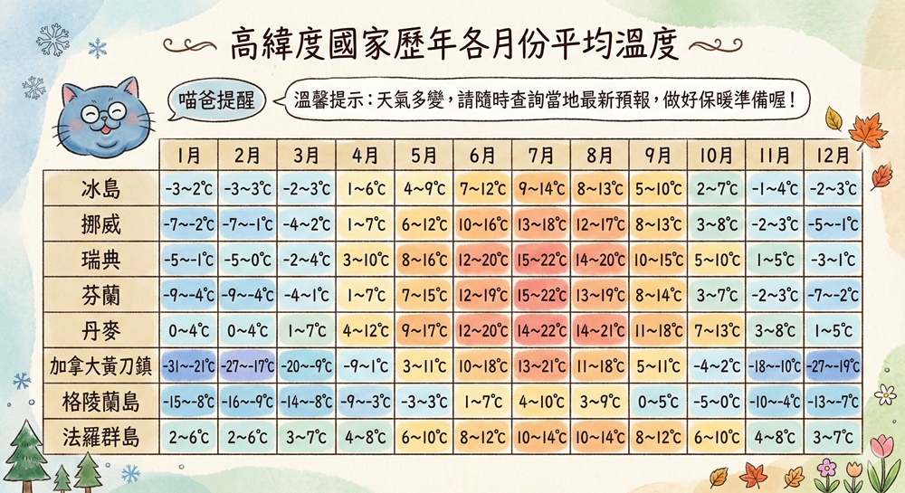 高緯度地區近年平均氣溫如下(僅參考用),由於極光都是晚上觀看,而且活動地點都在戶外空曠處,所以體感溫度會再降低10~20度以上。