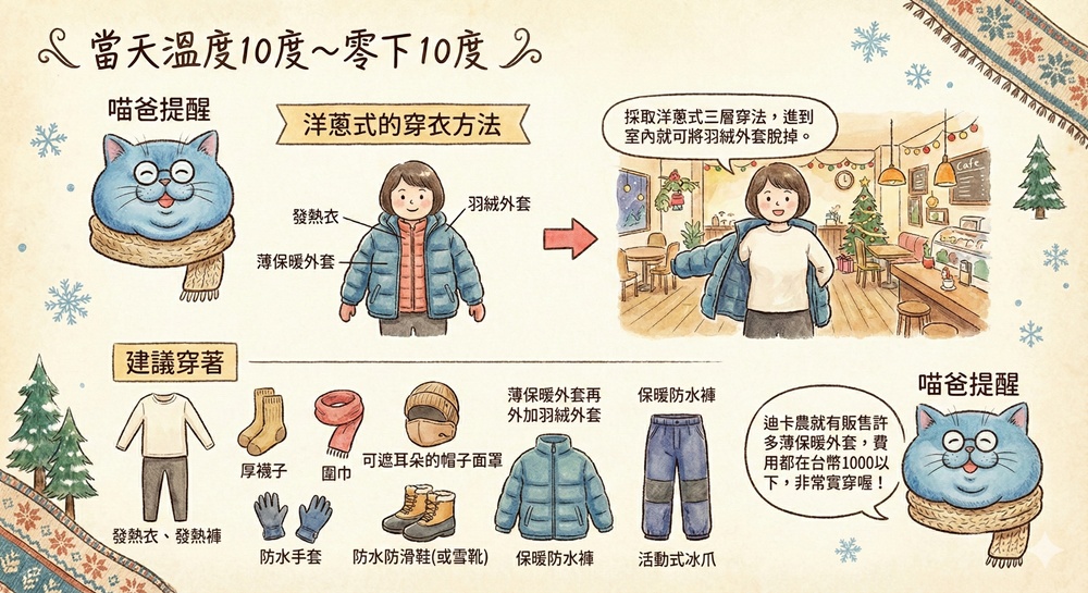 建議穿著:發熱衣、發熱褲、厚襪子、圍巾、防水手套、可遮耳朵的帽子面罩、薄保暖外套再外加羽絨外套、防水防滑鞋(或雪靴)、保暖防水褲,並且備著活動式冰爪