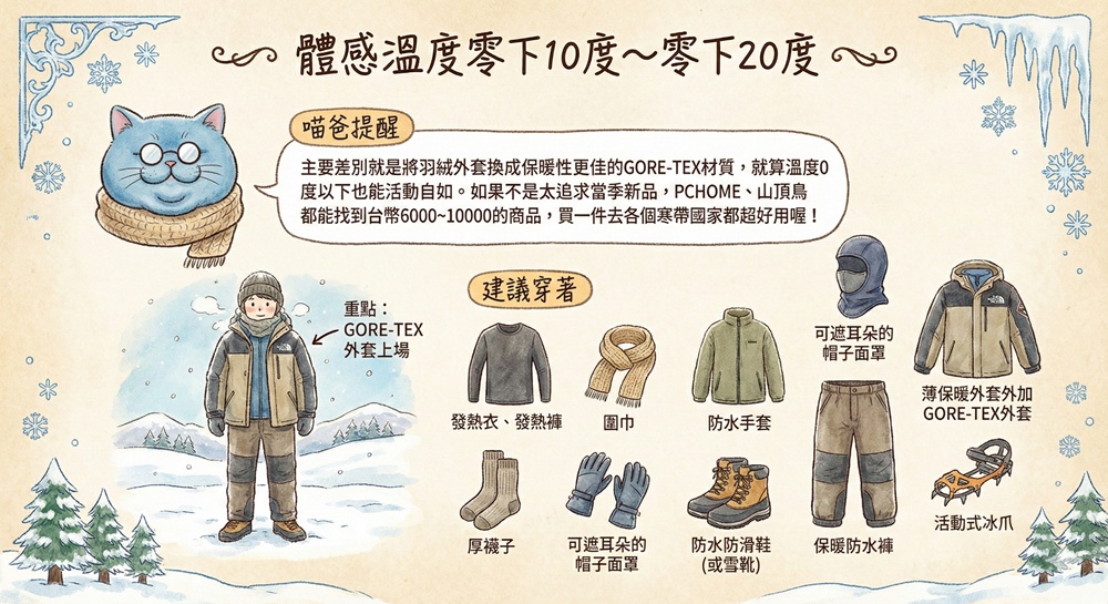 建議穿著:發熱衣、發熱褲、厚襪子、圍巾、防水手套、可遮耳朵的帽子面罩、薄保暖外套外加GORE-TEX外套、防水防滑鞋(或雪靴)、保暖防水褲,並且備著活動式冰爪
