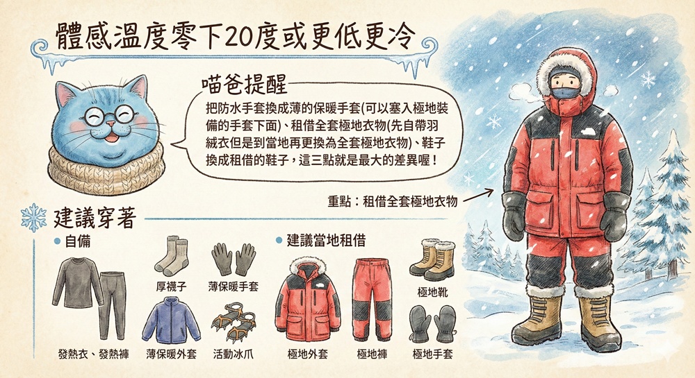 把防水手套換成薄保暖手套(可以塞入極地裝備的手套下面)、租借全套極地衣物(先自帶羽絨衣但是到當地再更換為全套極地衣物)、鞋子換成租借的鞋子,這三點就是最大的差異。