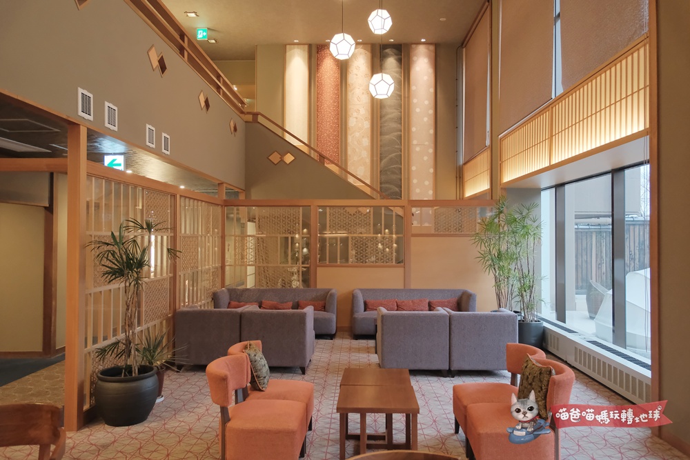 大廳的設計融合了傳統日式美學與些許現代摩登感,挑高的天花板配上巨大的原木樑柱,展現出老字號旅館的氣派。我特別喜歡大廳那一整排面向庭園的落地窗,午後的陽光灑落進來,配上柔和的燈泡色燈光,第一眼就給我有如家一般的舒適。