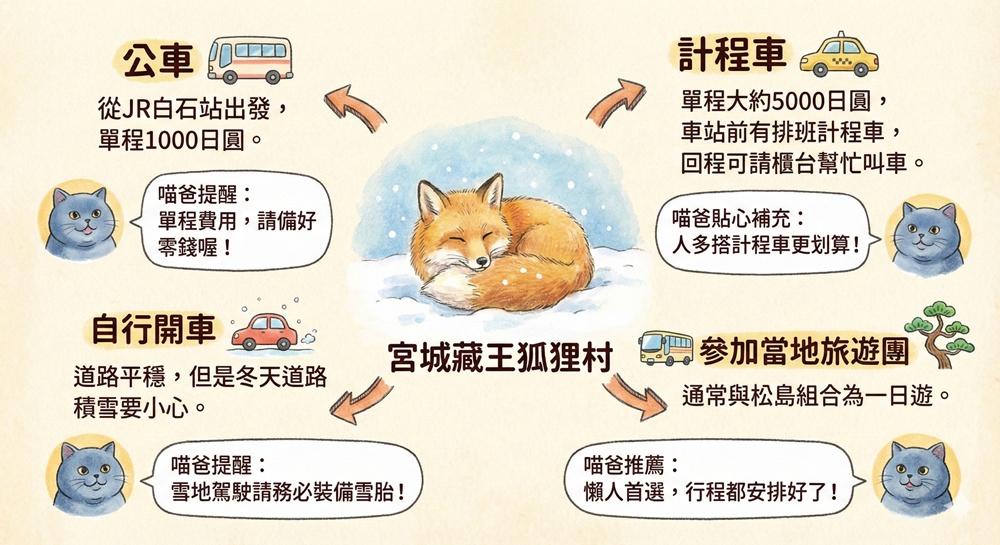 公車、計程車、自行開車、參加當地旅遊團,這就是前往宮城藏王狐狸村的四種交通方式