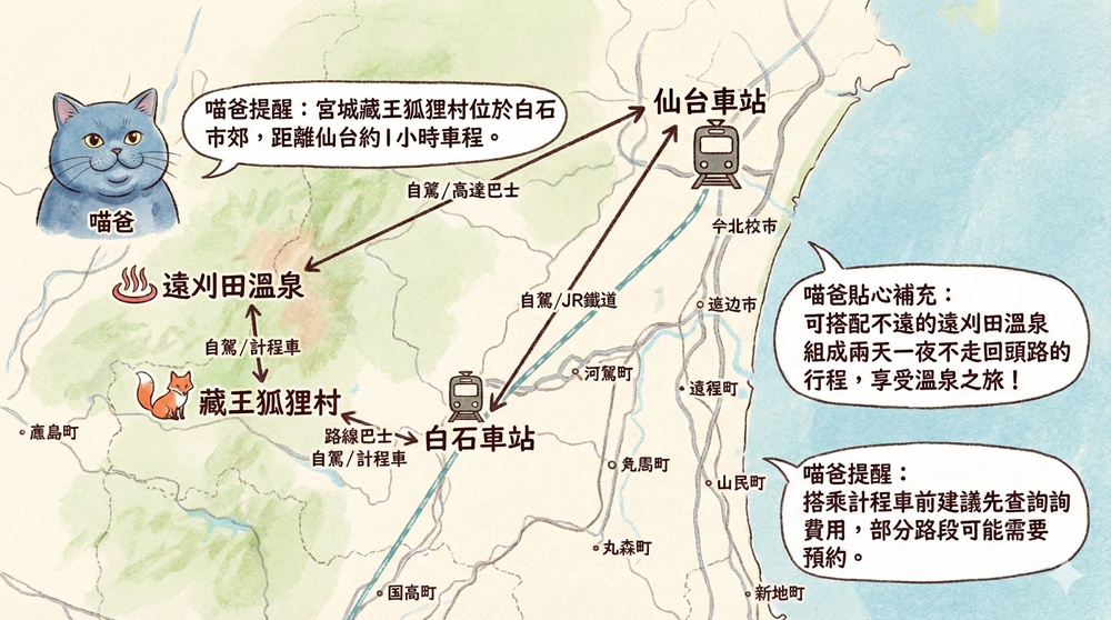 宮城藏王狐狸村位於白石市郊,與周邊城市相對位置如下圖,可以搭配不遠的遠刈田溫泉組成兩天一夜不走回頭路的行程。