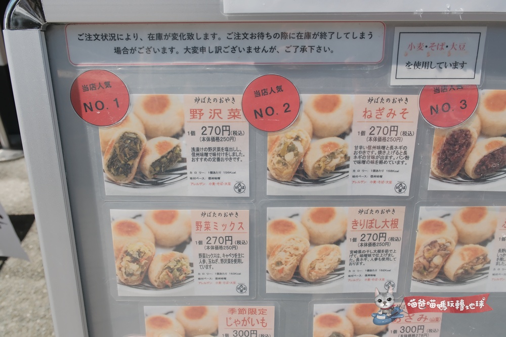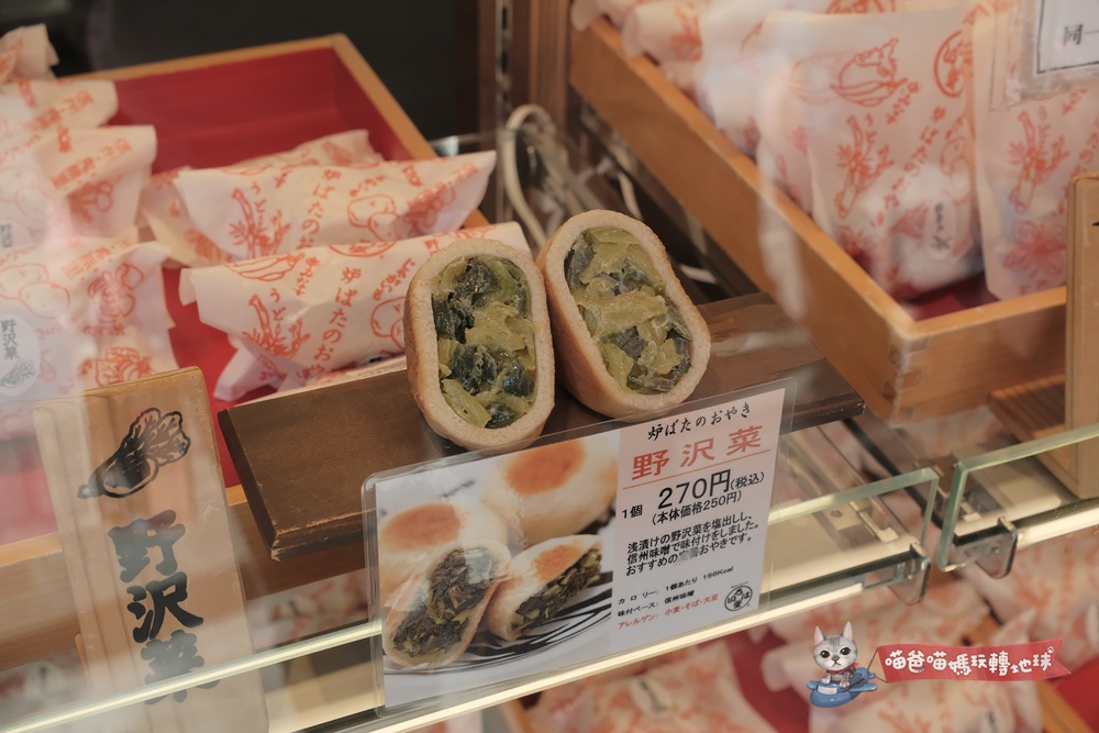 おやき(Oyaki)是一種長野傳統風味的烤餅,內餡會包著野澤菜、紅豆、南瓜或香菇等食材,喵爸隨意買了家剛出爐的野澤菜口味,熱騰騰的麵皮帶點焦香,配上鹹香脆口的野澤菜,在微涼的長野天氣裡吃上一口,不僅飽足感十足也相當暖胃。